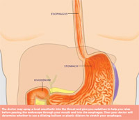 Your doctor might perform esophageal dilation with sedation along with an upper endoscopy. Your doctor may spray your throat with a local anesthetic spray, and then give you sedatives to help you relax. Your doctor then will pass the endoscope through your mouth and into the esophagus, stomach and duodenum. The endoscope does not interfere with your breathing. At this point your doctor will determine whether to use a dilating balloon or plastic dilators over a guiding wire to stretch your esophagus. You might experience mild pressure in the back of your throat or in your chest during the procedure. Alternatively, your doctor might start by spraying your throat with a local anesthetic. Your doctor will then pass a tapered dilating instrument through your mouth and guide it into the esophagus. Your doctor may also use x-rays during the esophageal dilation procedure.